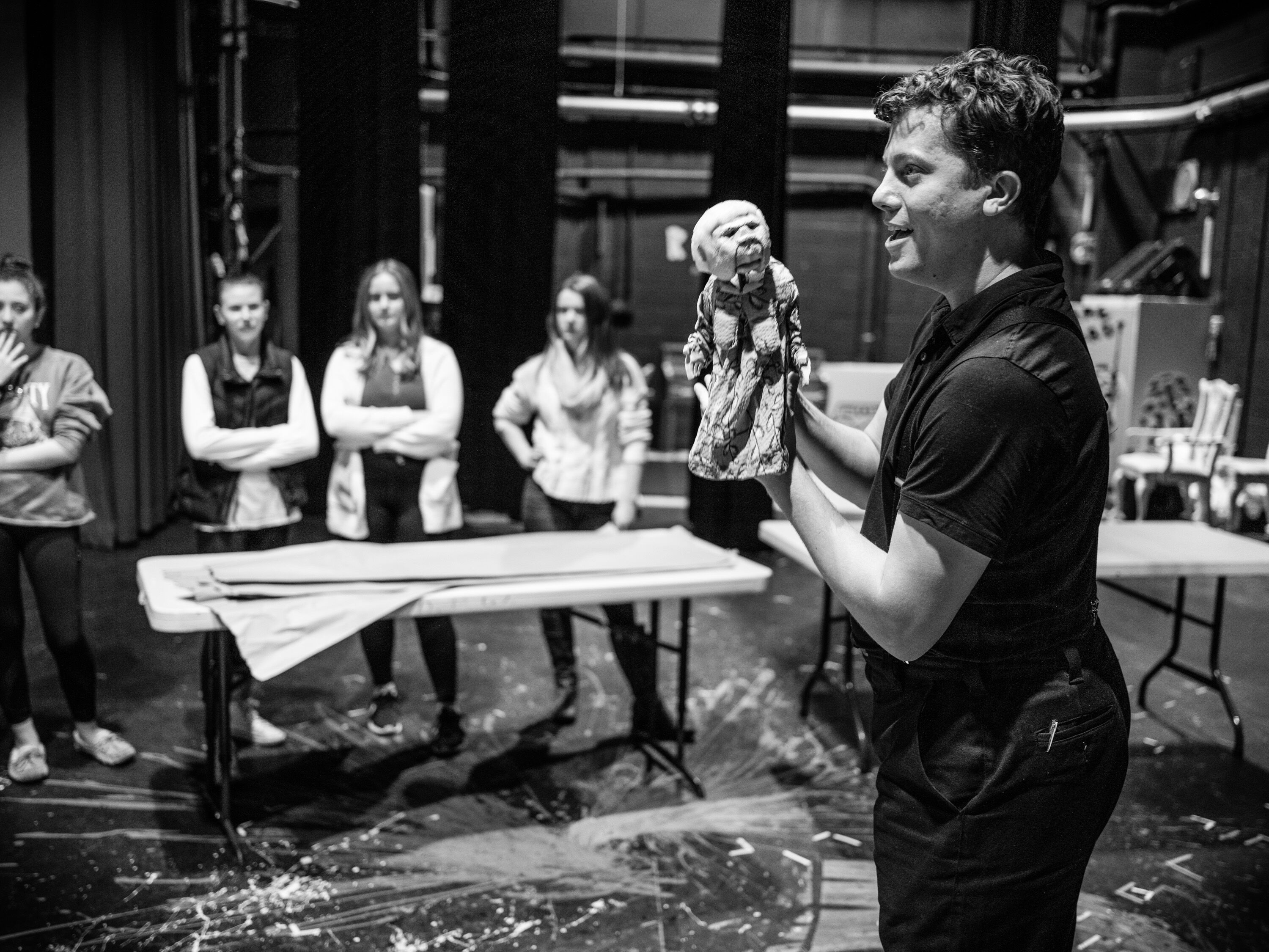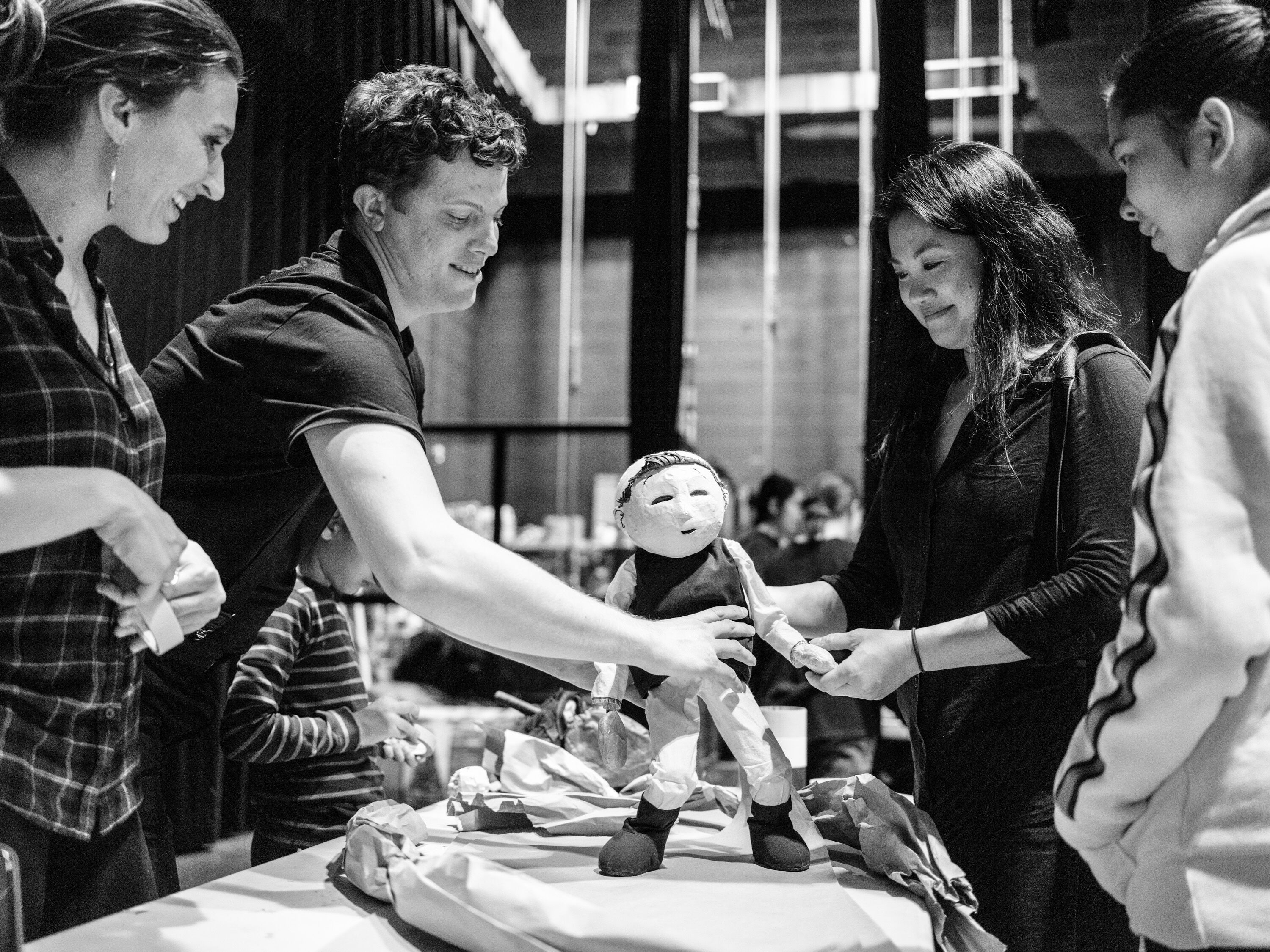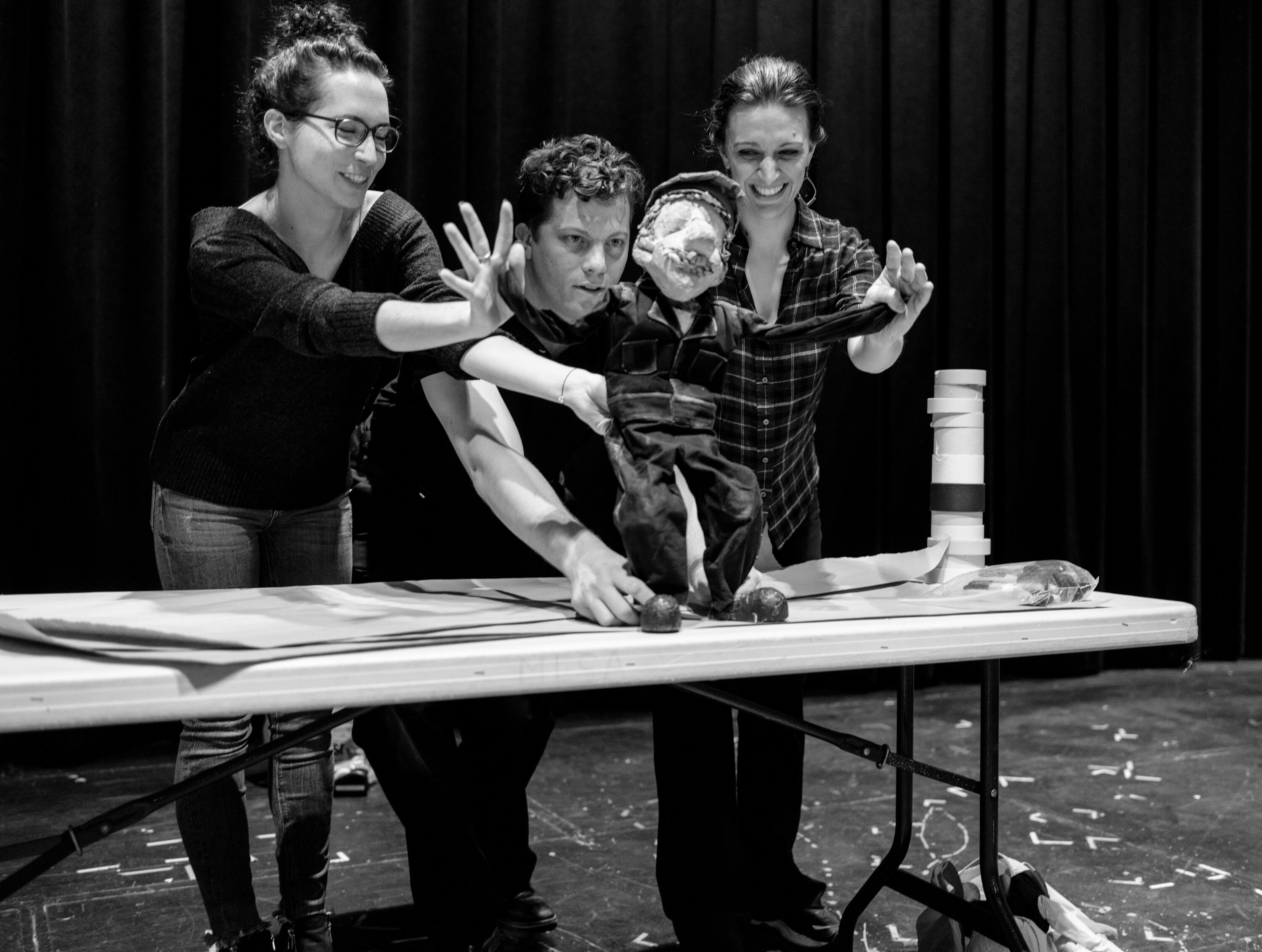 As an introduction to the world of puppetry, the cast participated in a workshop with Eric Wright, co-founder of NYC’s The Puppet Kitchen. Wright’s presentation included instruction on the fundamentals of Bunraku puppetry as well as guidance on puppet design.