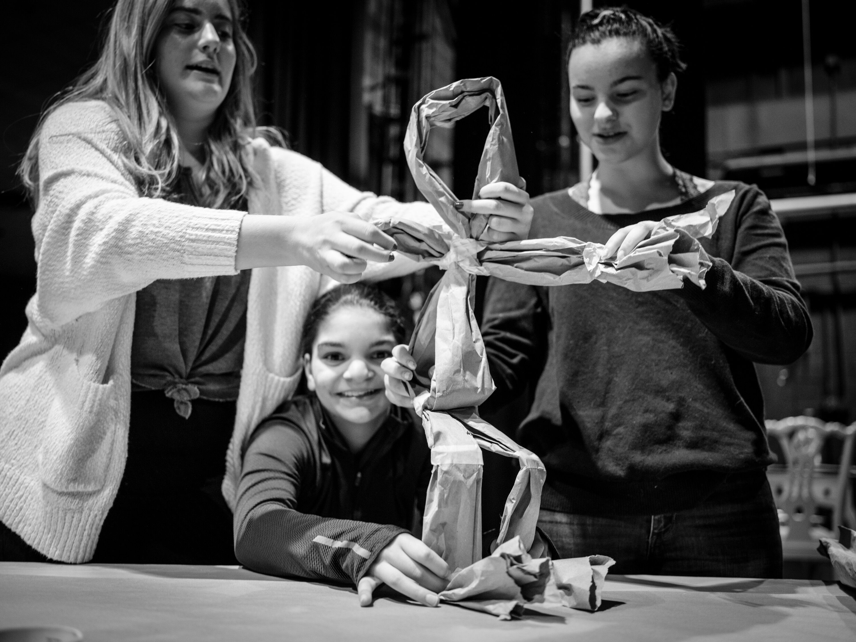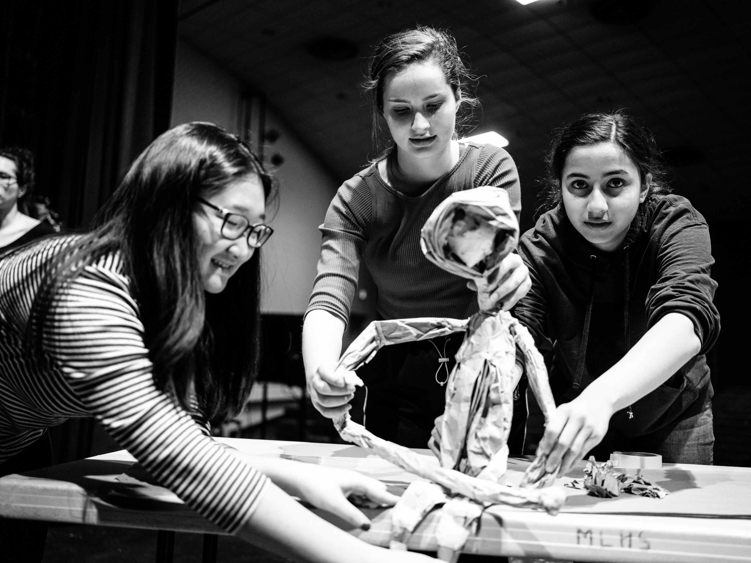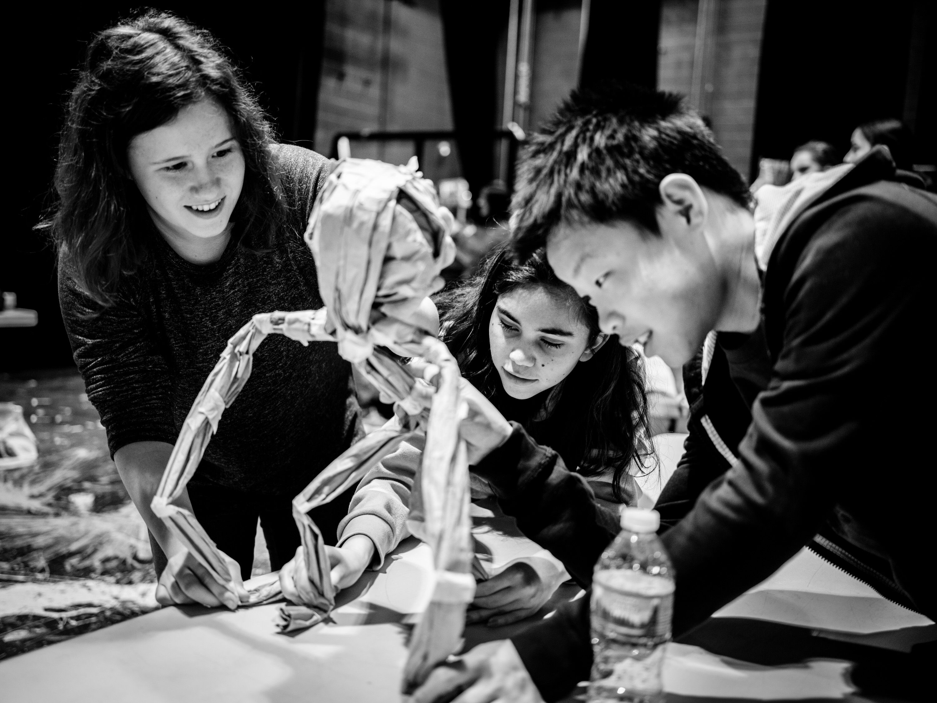 As an introduction to the world of puppetry, the cast participated in a workshop with Eric Wright, co-founder of NYC’s The Puppet Kitchen. Wright’s presentation included instruction on the fundamentals of Bunraku puppetry as well as guidance on puppet design.