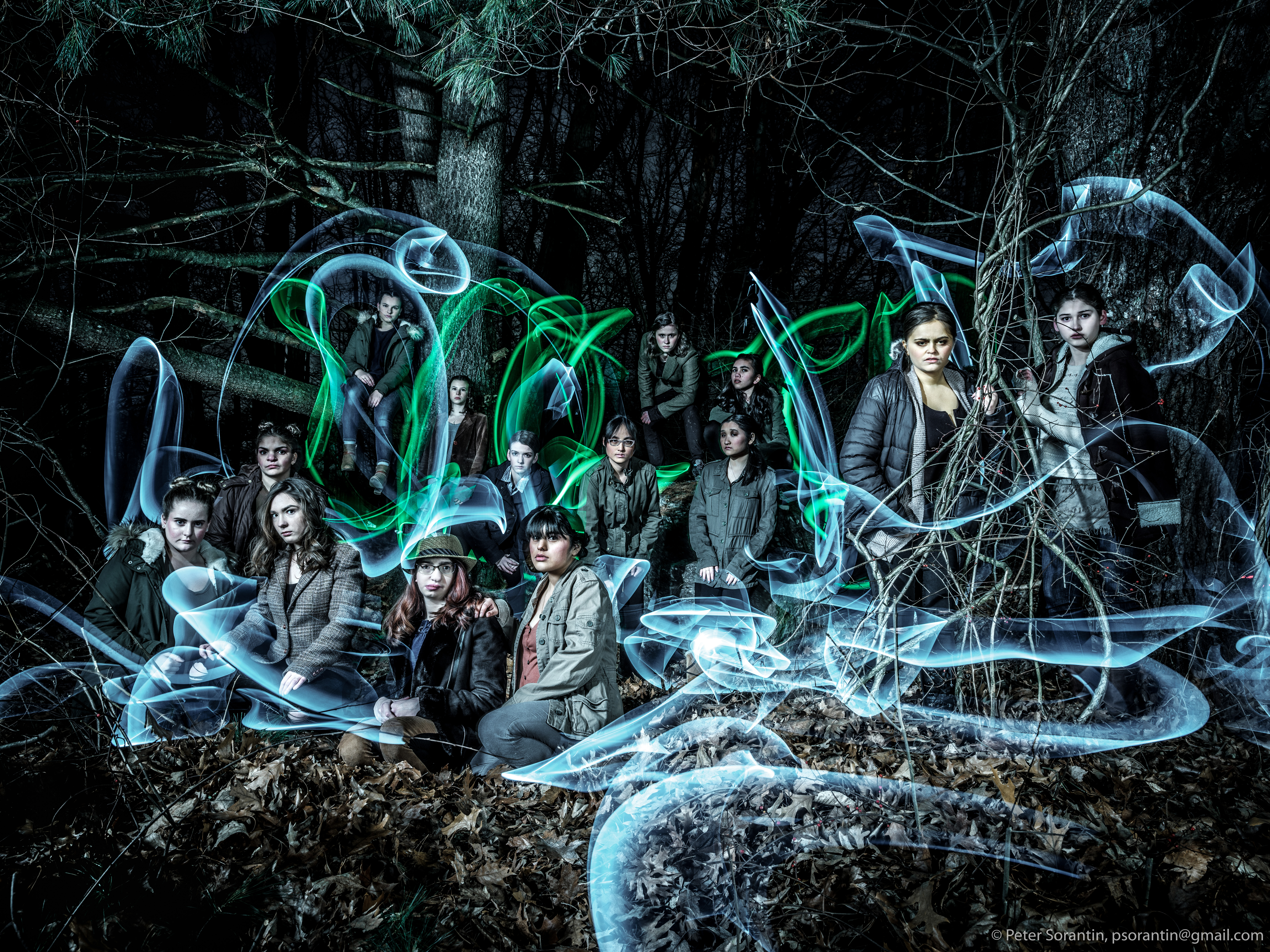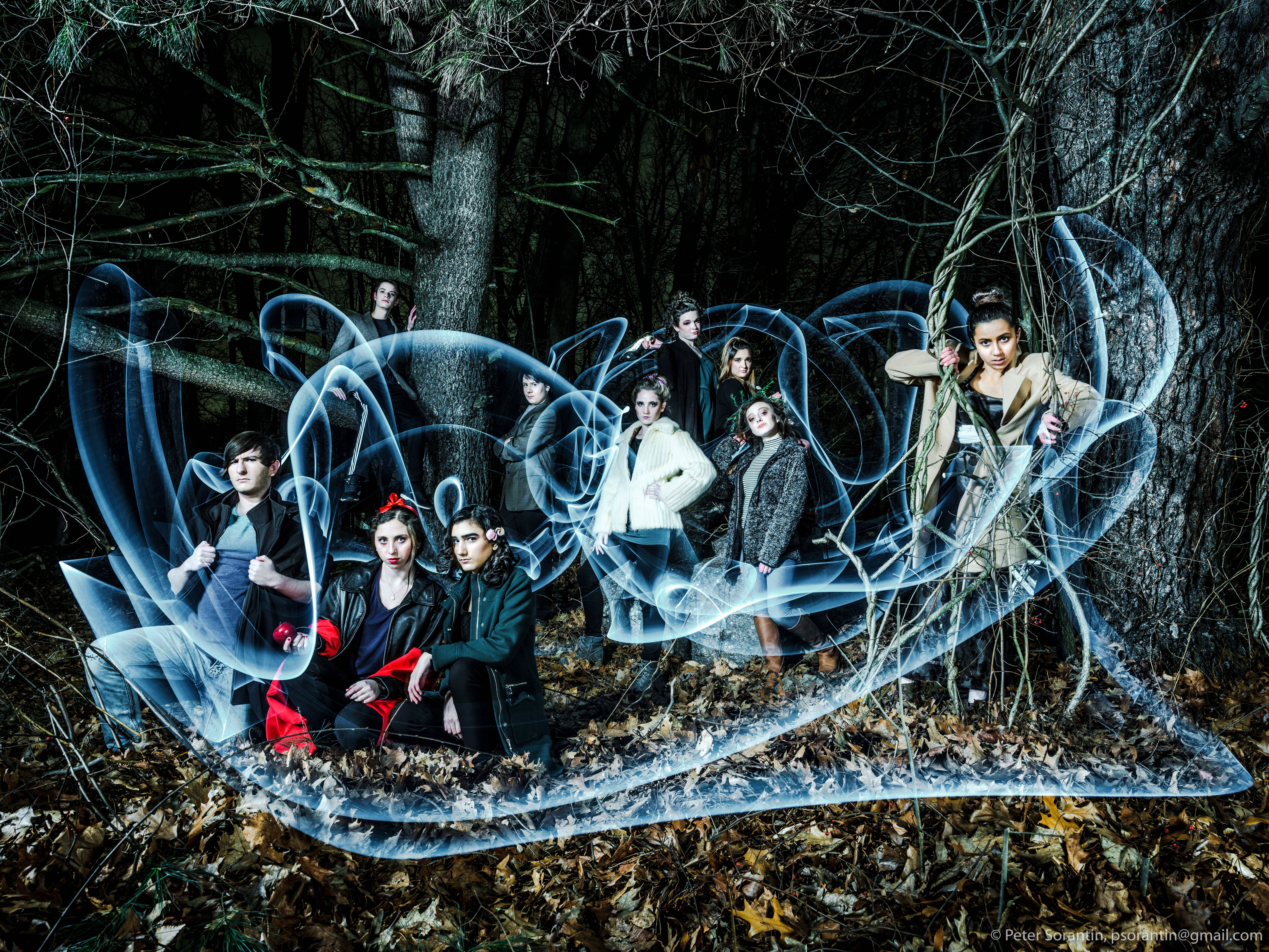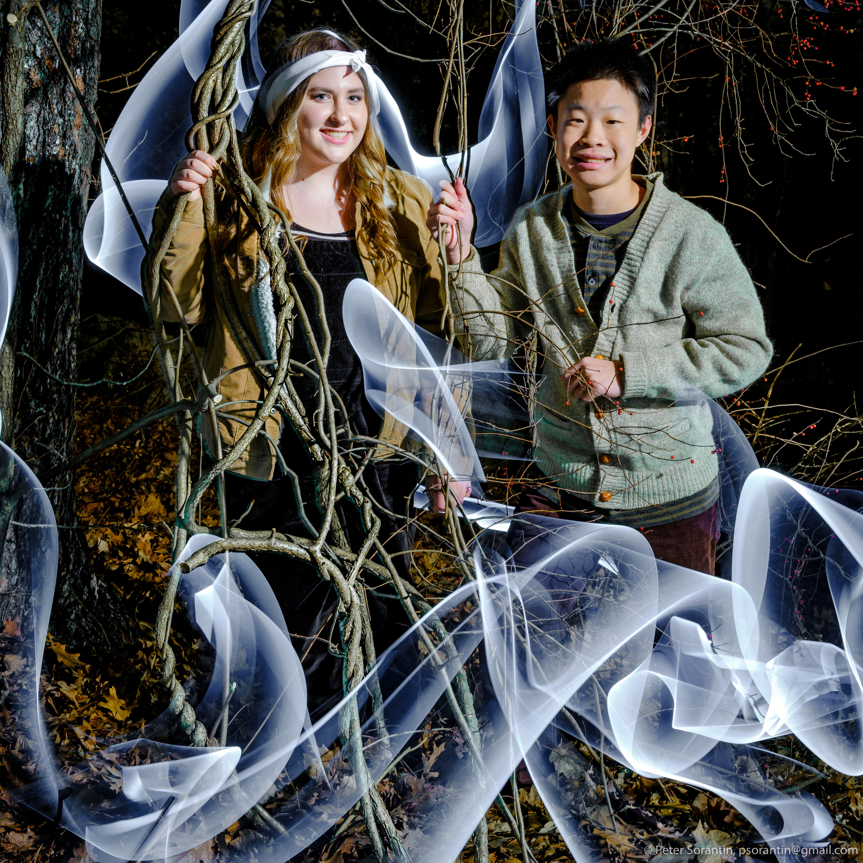 Along the road of developing the show’s aesthetic and personality, the cast members held a photo shoot with Mountain Lakes parent and talented photographer Peter Sorantin. Taking place in our very own woods, the magical spirit of the photo shoot was helped by light painting photography. In short, light painting photography uses lights to paint a design while a camera is left open during a long exposure photograph. While the actors stayed very still, the photographer’s assistants, including MLHS junior Meg Hatton, ran around the actors with the special light paint to create the whimsical design. (All the fantastic photos you see in this article can be credited to Peter Sorantin.)