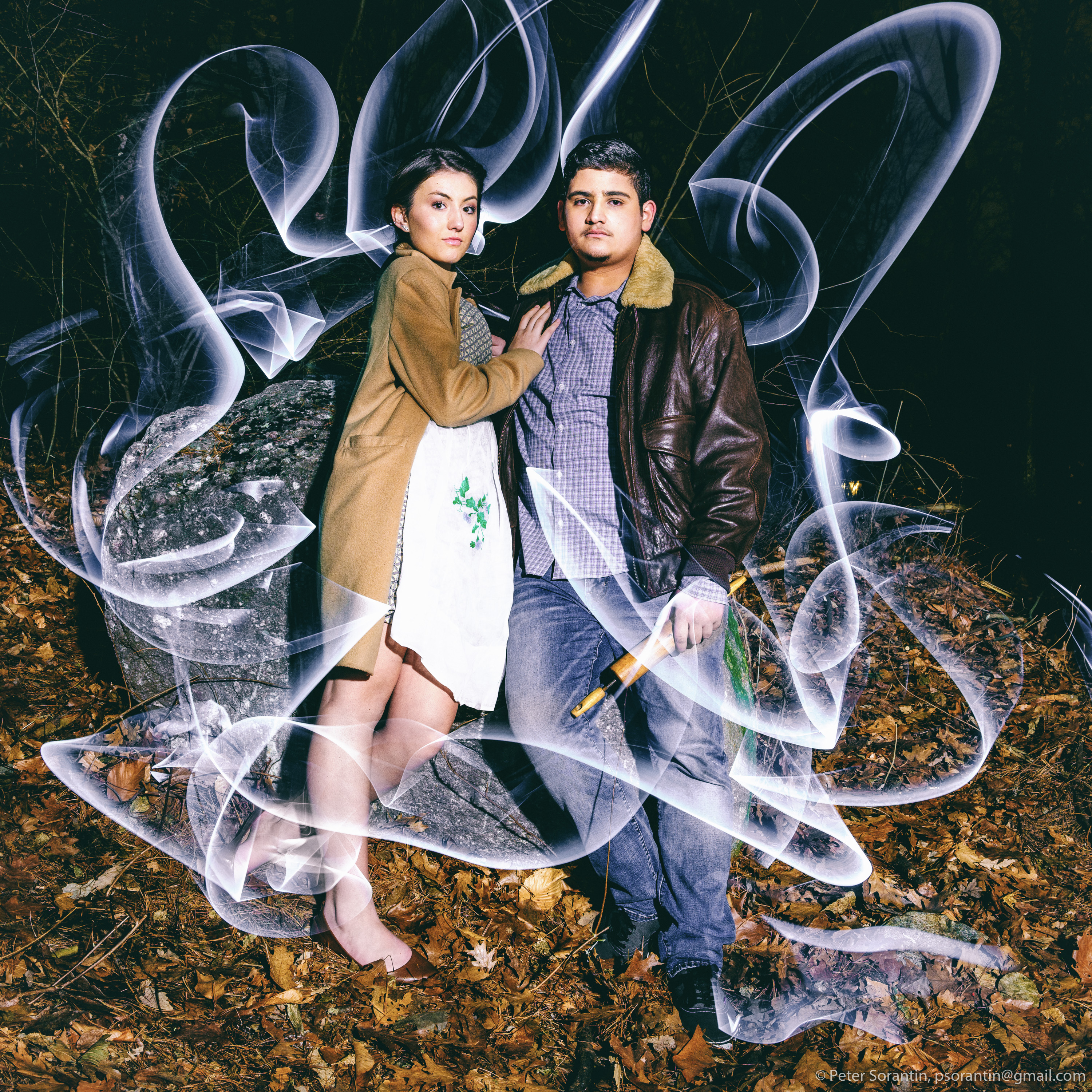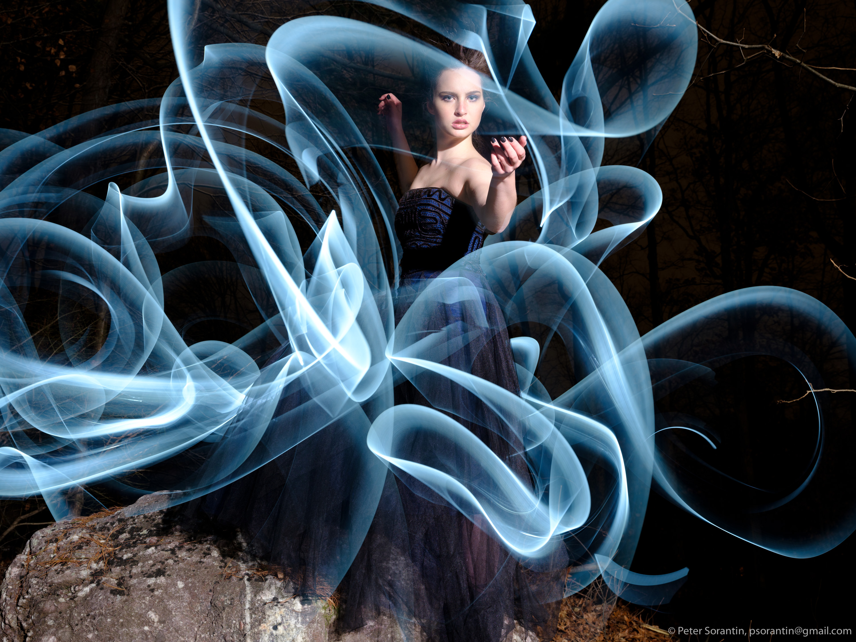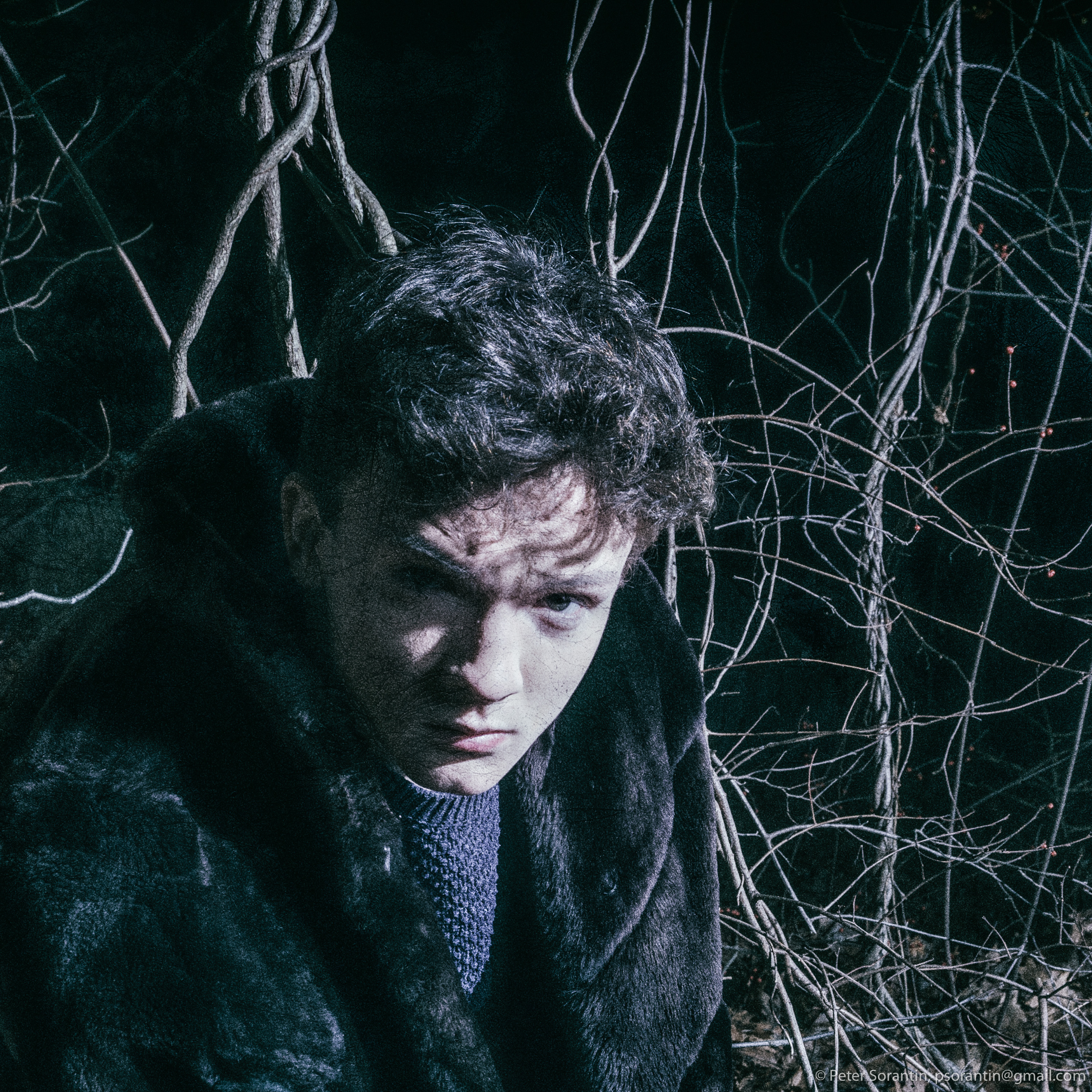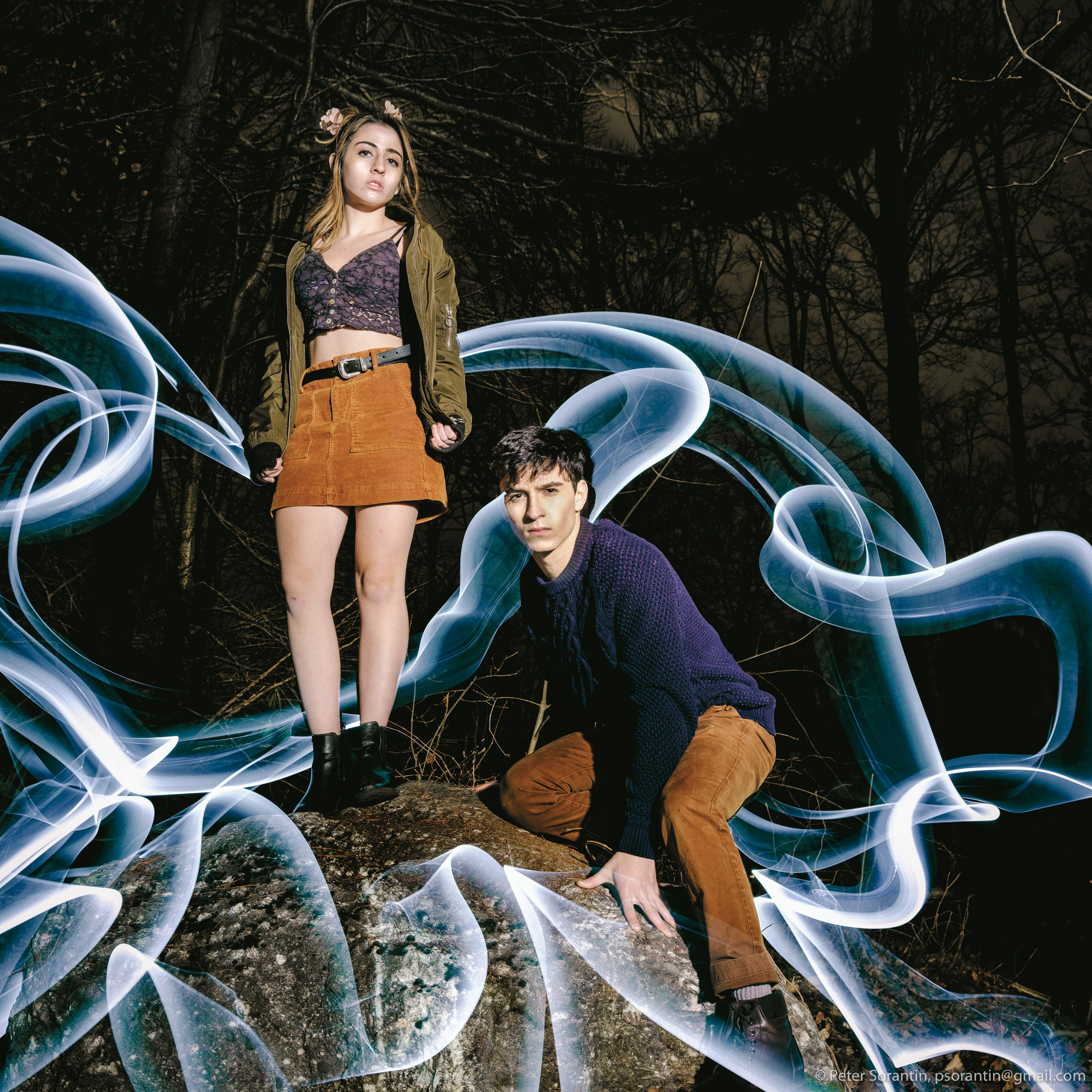 Along the road of developing the show’s aesthetic and personality, the cast members held a photo shoot with Mountain Lakes parent and talented photographer Peter Sorantin. Taking place in our very own woods, the magical spirit of the photo shoot was helped by light painting photography. In short, light painting photography uses lights to paint a design while a camera is left open during a long exposure photograph. While the actors stayed very still, the photographer’s assistants, including MLHS junior Meg Hatton, ran around the actors with the special light paint to create the whimsical design. (All the fantastic photos you see in this article can be credited to Peter Sorantin.)